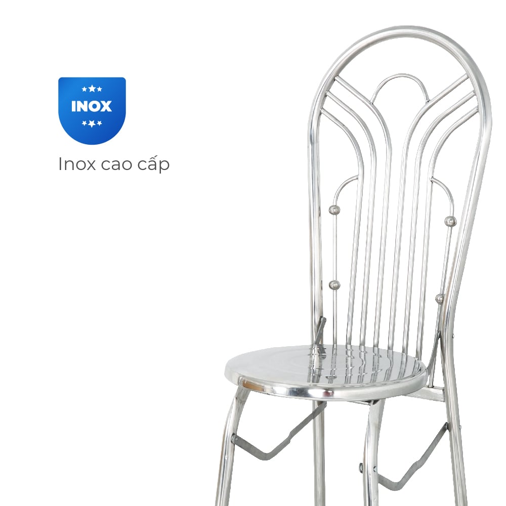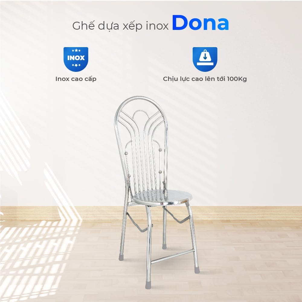 Ghế dựa xếp DONA inox là lựa chọn lý tưởng cho không gian hiện đại, giúp khắc phục nỗi lo ghế cồng kềnh, khó di chuyển và nhanh hỏng khi dùng lâu. Khung inox sáng bóng, chịu lực tốt, chống gỉ sét; lưng cong ôm dáng ngồi êm ái; mặt ghế thép sơn tĩnh điện chắc chắn; chân có đế nhựa chống trượt; đặc biệt dễ xếp gọn, tiết kiệm diện tích tối đa.